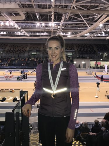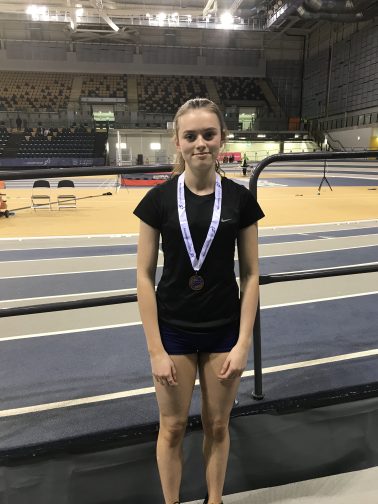 Central AC’s Amy Gullen was back on form as she leapt to an excellent bronze medal in the high jump at the Scottish national indoor championships at the Emirates Arena in Glasgow. The 19 year old from Muckhart came into the event confident after clearing 1.66m at the national open 2 weeks earlier, her best for 3 years. She put herself in contention with first time clearances at 1.54m and 1.59m. She then cleared an excellent 1.64m at the first attempt to confirm her in the top 3. The bar was then raised to 1.69m which would be a new personal best and club record height. Amy had 3 good attempts and in the final attempt looked like she was well clear of the bar only to knock it off with her heel. This meant she had to settle for bronze but with gold and silver going to athletes from Ireland and England she had the consolation of being the top placed Scot. Commenting afterwards Amy said “I know the big jump is there, it all just needs to click into place.” Amy is looking to broaden her horizons with competitions in Europe to give her further opportunities and will hopefully be competing in Spain next. Through these, she hopes to find that 1.70m plus jump that she has the potential to do.