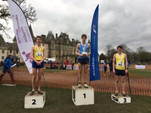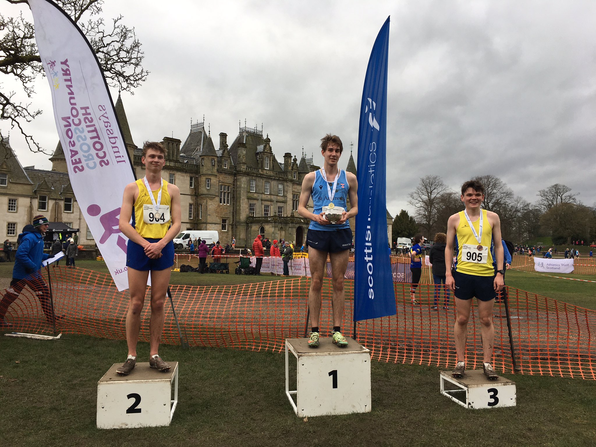 Central’s Under-20 Men continue to impress and here Ben MacMillan and Alastair Marshall were locked in a tough battle for individual silver and bronze medals. As the 6.8 kilometre course flew by for these talented runners Alastair mas making progress on the hills with Ben looking good on the flat. The final sprint saw Ben prevail to take the silver medal with 22:13 and Alastair just a couple of strides behind to lift bronze with 22:14. Back up here was provided by Sam Grivell (30th; 25:22) and Euan Andrews (55th; 29:02) with the team being rewarded with silver team medals.
